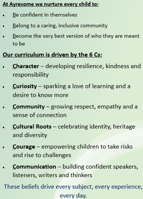 We celebrate what it means to be part of the Ayresome community through a diverse and inclusive offer which reflects our school’s identity, providing opportunities for children to express themselves, take pride in their environment, and feel a strong sense of place.